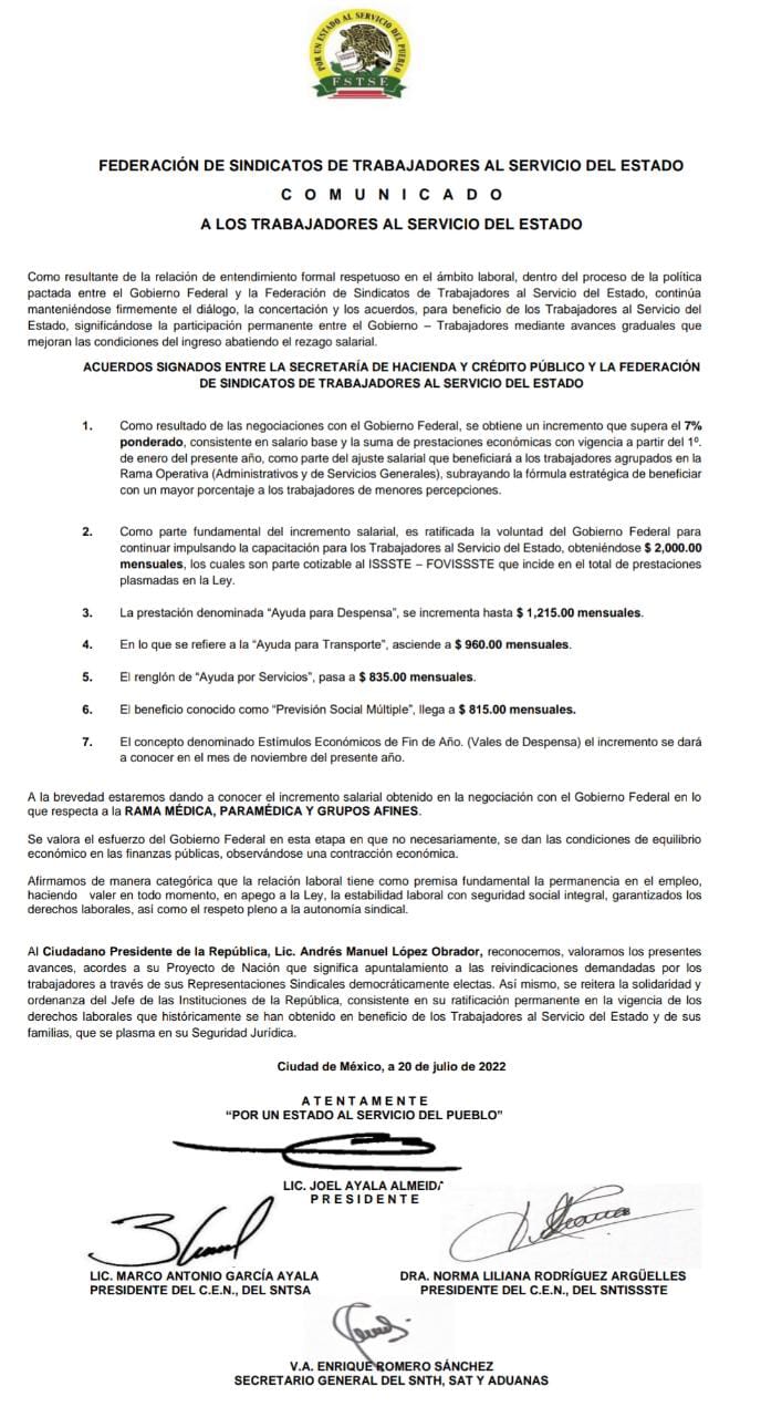Ciudad de México 20 de julio 2022.- La Federación de Sindicatos de Trabajadores al Servicio del Estado informa que como resultado de las negociaciones realizadas con el Gobierno Federal, obtiene un incremento salarial que supera el 7% ponderado, consistente en salario base y la suma de prestaciones económicas con vigencia a partir del 1º de enero del presente año.