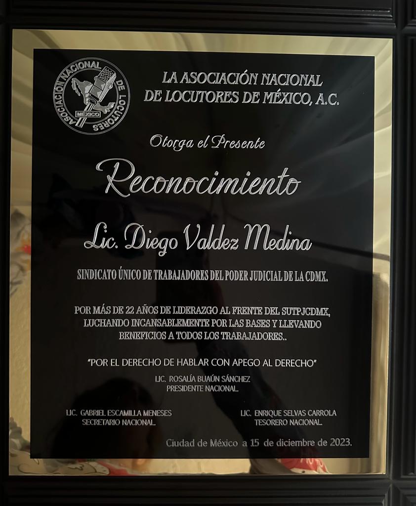 Ciudad de México 18 de diciembre 2023.- La Asociación Nacional de Locutores, reconoció al Lic. Diego Valdéz Medina, por su trayectoria como líder del Sindicato Único de Trabajadores del Poder Judicial de la Ciudad de México, quien a lo largo de cerca de 30 años ha logrado conquistas laborales que benefician a los empleados de base de esa importante institución.